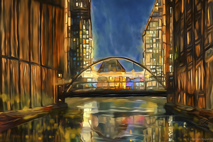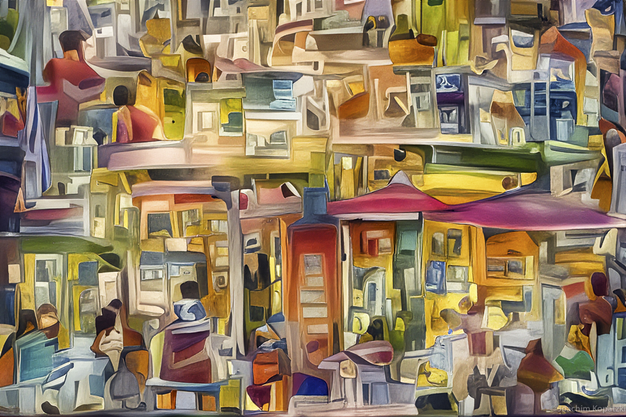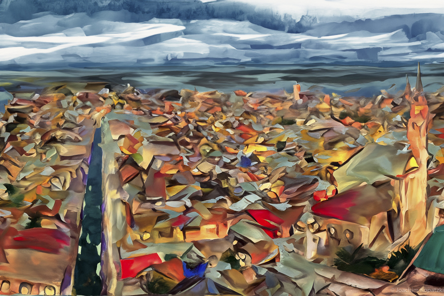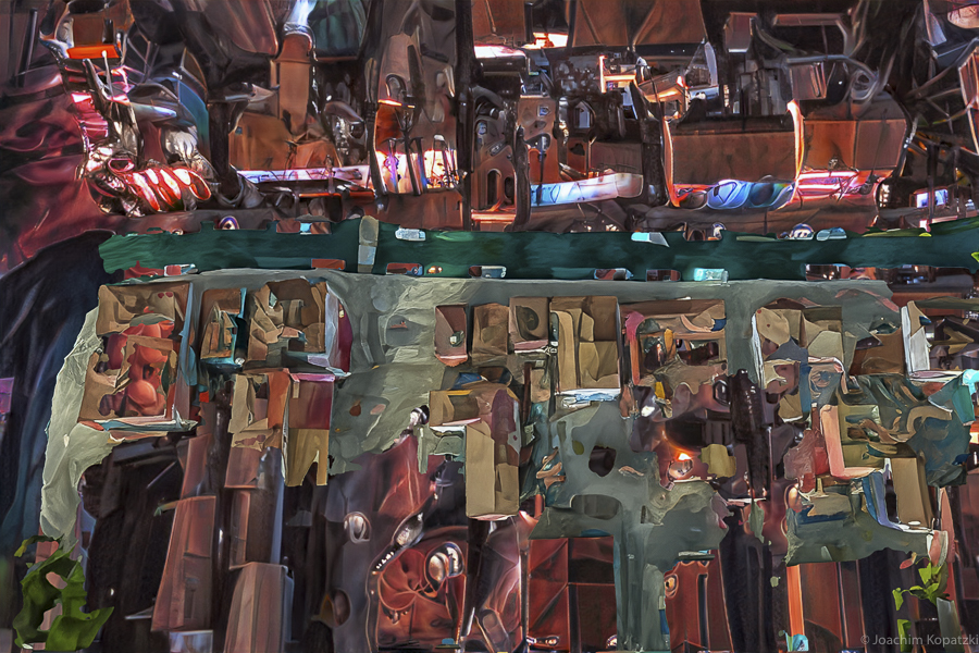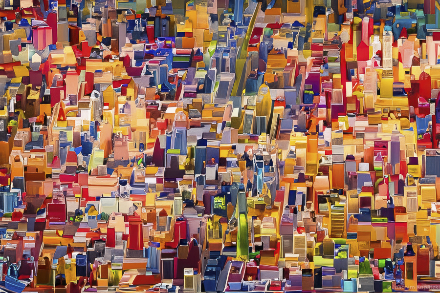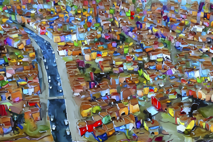 Fotografien, die zu Grafiken oder Gemälden werden: Digitale Art. Grundlage sind Fotos, die mit verschiedenen Techniken digital bearbeitet sind, dabei sind z.B. für ein Werk auch mehrere Fotografien verwendet worden. Auch Luftaufnahmen, die zu digitalen Bilder wurden, sind dabei.